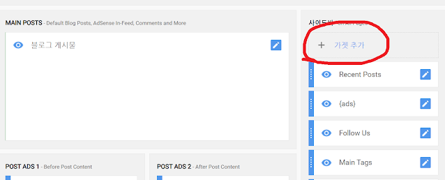 다른 기능들은 가젯을 추가하면 블로그 화면 사이드바에 추가 되지만 여기서 추가하는 가젯은 보이지 않습니다. 가젯 추가를 클릭합니다.