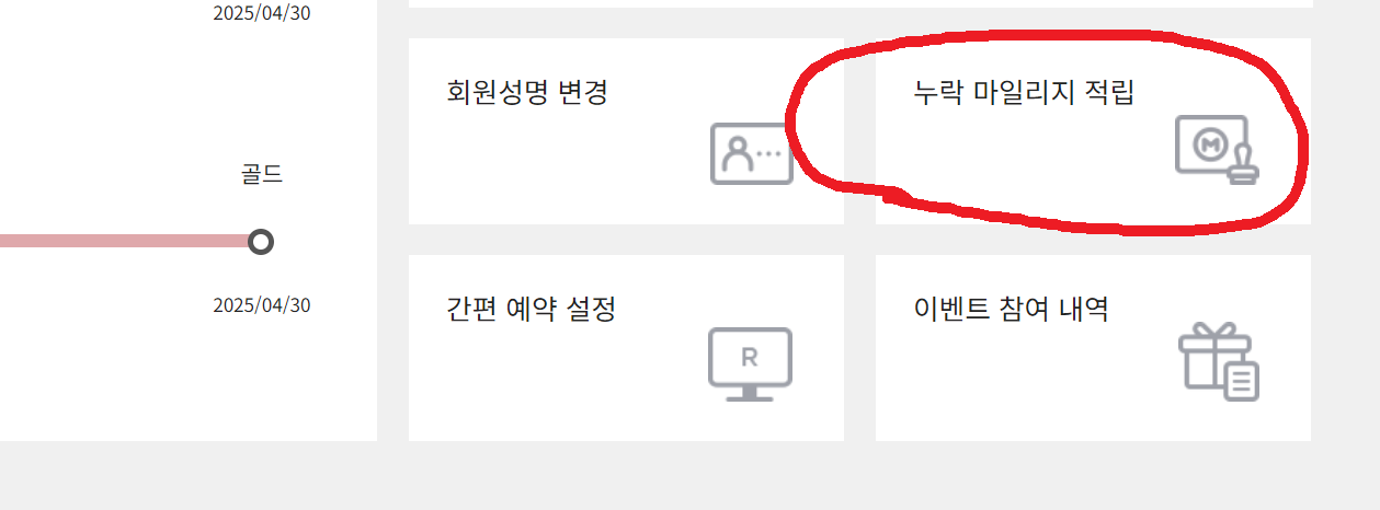 2. 마이 아시아나 페이지를 아래로 스크롤 해서 내려가면 누락 마일리지 적립 메뉴가 있습니다.